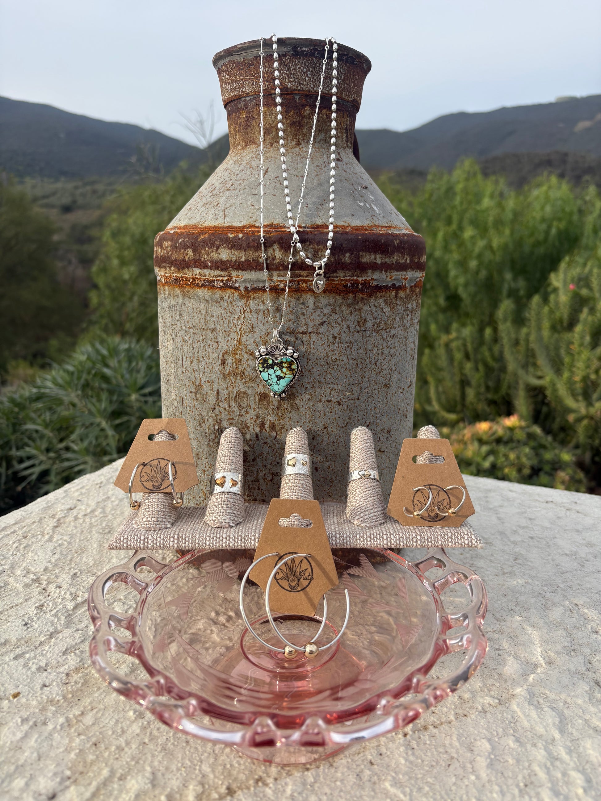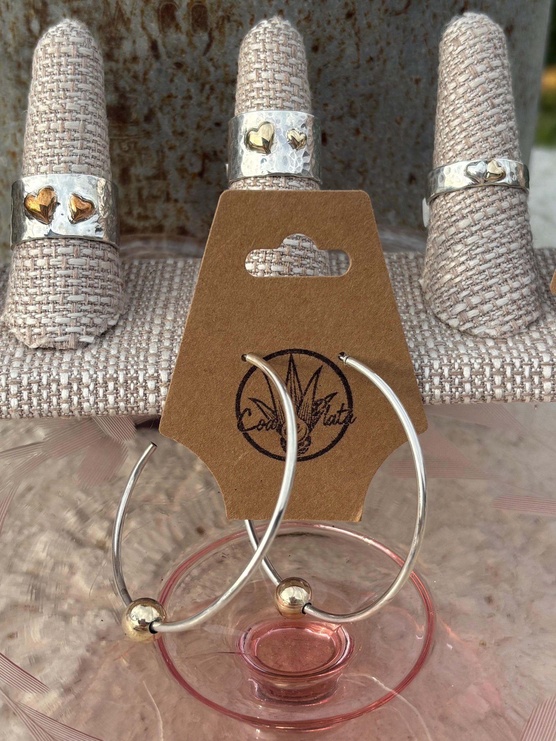Two 14k Hearts on hand hammered, hand forged 925 sterling for double the love! Ring sits 1/2 inch on finger from top to bottom. Each Ring Sold Separately; for this Valentines Collection there are 3 in stock but any size is available at Custom. Just select Custom and email me your size.